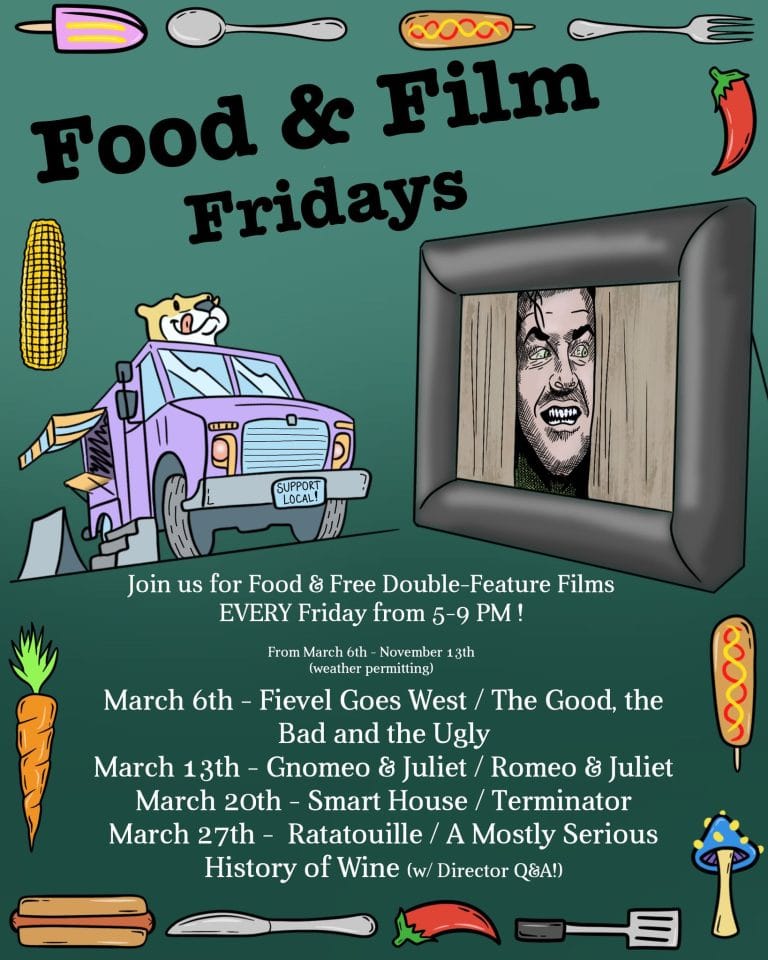Outdoor double-feature movie night (one family-friendly, one adult) plus rotating food trucks, 10+ local artisans, yard games, and 15+ craft beers on tap. All ages, dog-friendly.
