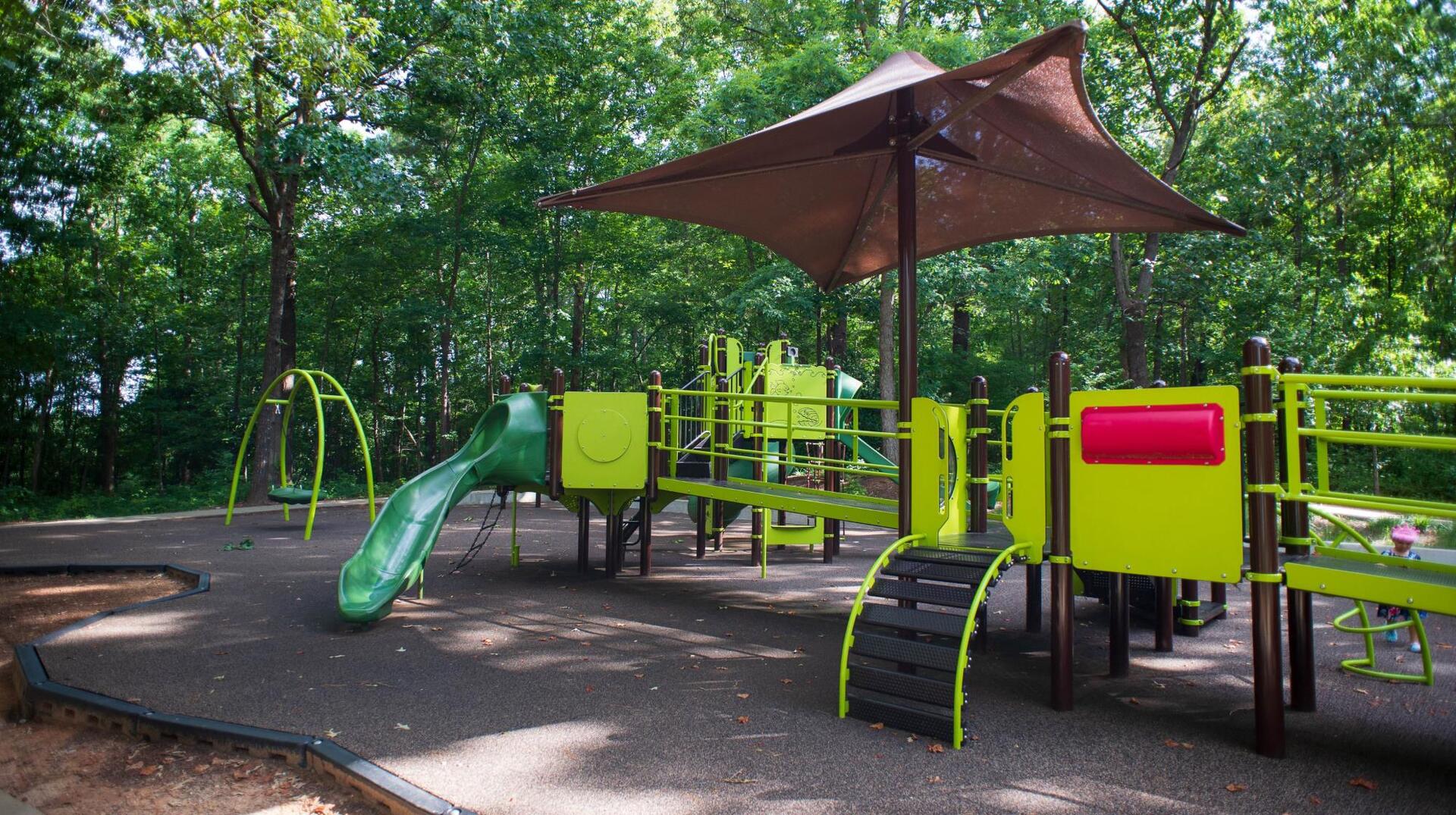 Start at the shaded playground, which has separate structures for little kids and bigger kids plus ramps and a soft surface.